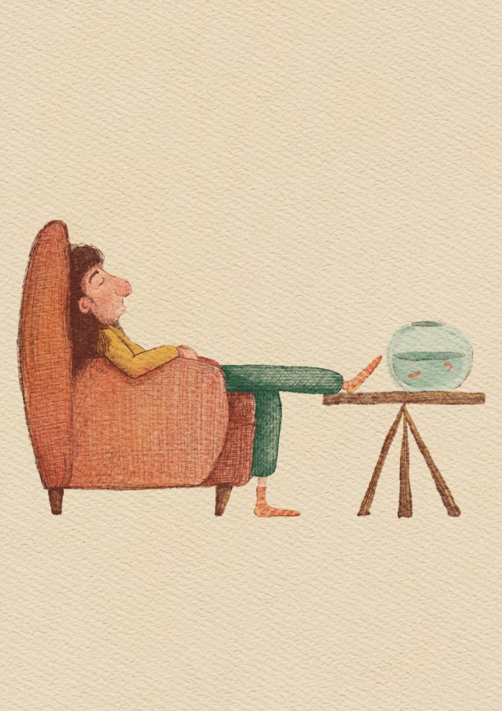 Un personnage qui s’assoupit, un pied posé sur la table, à côté d’un aquarium où deux poissons tournent en rond sans se poser de questions.