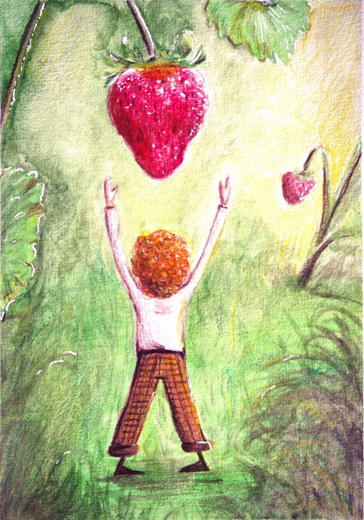 J’ai imaginé un monde où les humains seraient de la taille d’un insecte. Ici, un enfant tente d’attraper une fraise suspendue au-dessus de lui.
