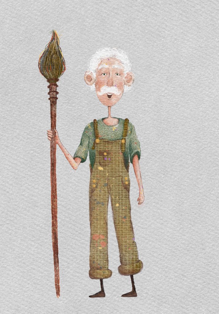 Un vieux peintre, les mains tachées de couleurs, tient son pinceau comme une torche.